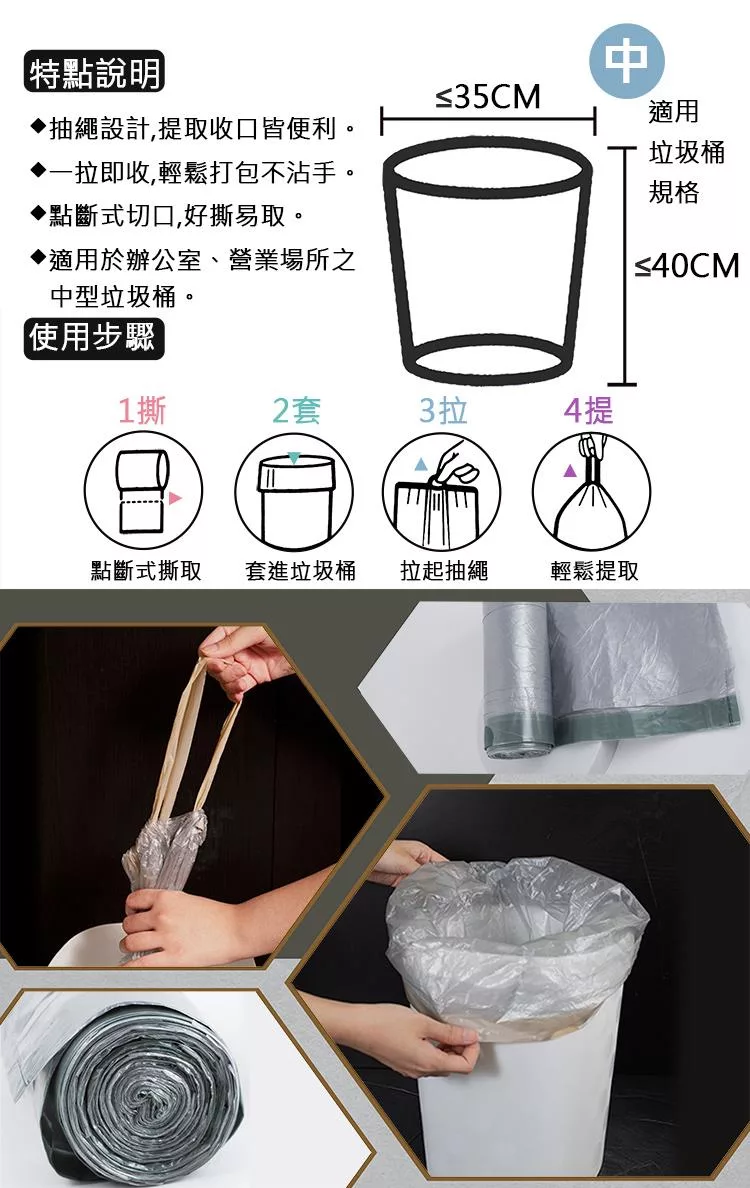 適用於家庭、辦公室、營業場所之寬35 x 高40cm中型垃圾桶,點斷式切口好撕易取,抽繩設計提取收口皆便利,一拉即收輕鬆打包不沾手,是您收納整理好幫手。