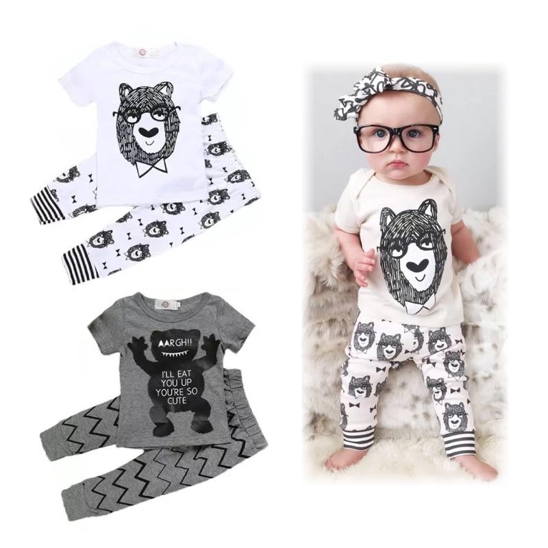 [現貨]歐美風可愛小怪獸寶寶純棉短袖套裝(上衣+褲子)