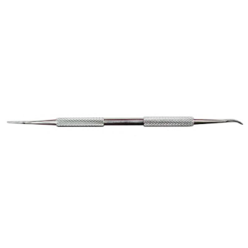 施作嵌甲的部位,協助嵌甲挑起。 特殊的鋸齒狀可用於甲溝兩側進行硬皮的去除 嵌甲雙頭不銹鋼磨棒 尺寸: 總長13.5cm 口徑約0.5cm