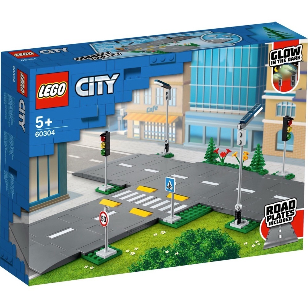 盒裡有什麼?孩子會獲得 5 片樂高? 城市道路底板,包含路面標示、減速丘與斑馬線,此外還有夜光路燈、玩具紅綠燈、道路標誌、樹木與綠色植物。