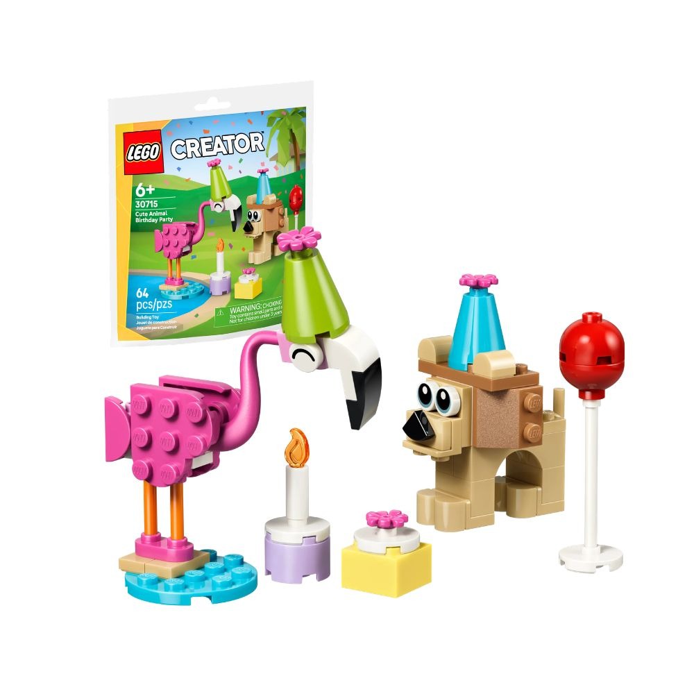 用這款動物盒組讓生日慶祝活動增添可愛氛圍!裡面有戴著派對帽的紅鶴與獅子,以及氣球、禮物和生日蛋糕。