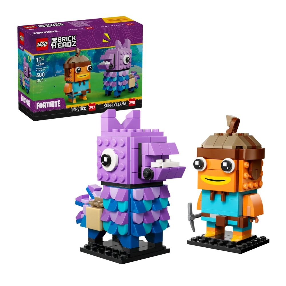 電玩主題收藏品-藉由這款 LEGO® Fortnite® BrickHeadz™ 補給駱馬和魚柳玩偶(40881)為你的電動遊戲周邊收藏增添新成員!此拼砌盒組適合 10 歲以上男生、女生與孩子 2 個《FORTNITE®》角色玩偶-此拼砌組合包含藍/紫雙色的 BrickHeadz™ 補給駱馬玩偶,以及附十字鎬配件的橘色 BrickHeadz™ 魚柳玩偶 可遊玩與展示的玩具-孩子可用這些 LEGO® Fortnite® 系列玩具扮演角色,展開電動遊戲主題冒險,等到冒險結束再擺出來展示 電動遊戲主題裝飾品-拼砌完成後,這些玩偶會是值得收藏的電玩主題裝飾品,可讓拼砌者擺在臥室或辦公室展示 電玩主題送禮點子-此拼砌盒組是一款樂趣無限的電動遊戲主題禮品,適合男孩、女孩與各年齡層的電動玩家,可在生日或其他特別日子贈送 尺寸-此盒組包含 300 個零件。補給駱馬玩偶高逾 10 公分、魚柳玩偶高逾 10 公分
