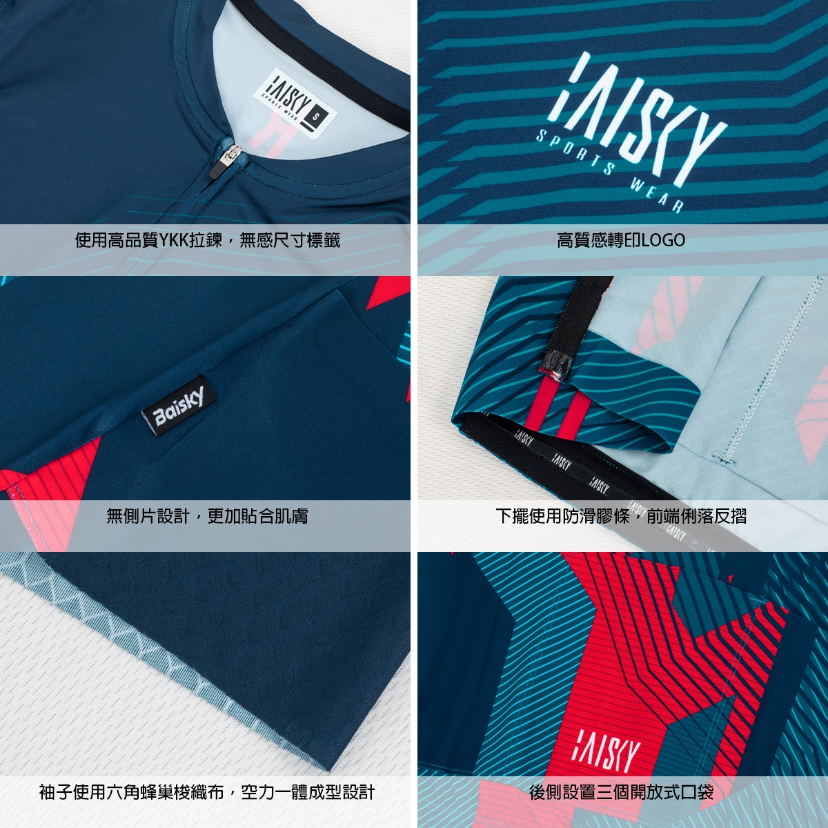 ● 袖子使用六角蜂巢梭織布,空力一體成型設計