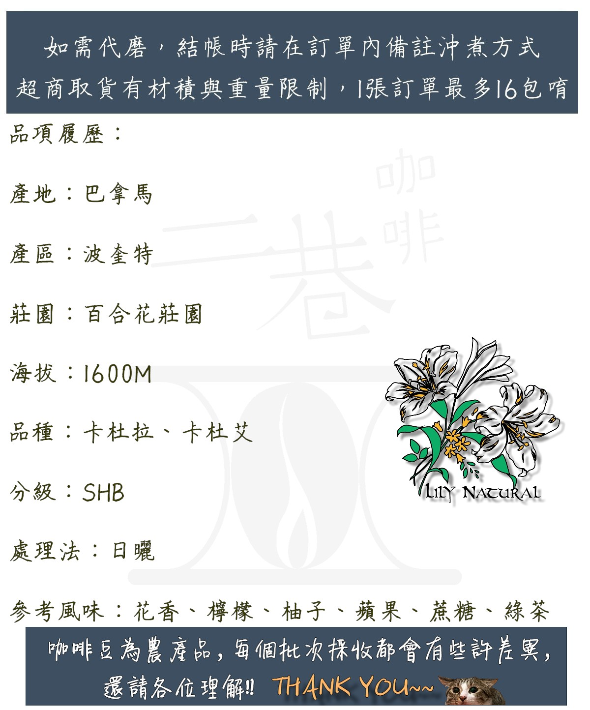 『二巷』☆☆巴拿馬 百合花莊園 日曬 卡杜拉 半磅裝 精品咖啡豆 接單後烘焙 可手沖義式美式冰滴虹吸摩卡壺冰釀