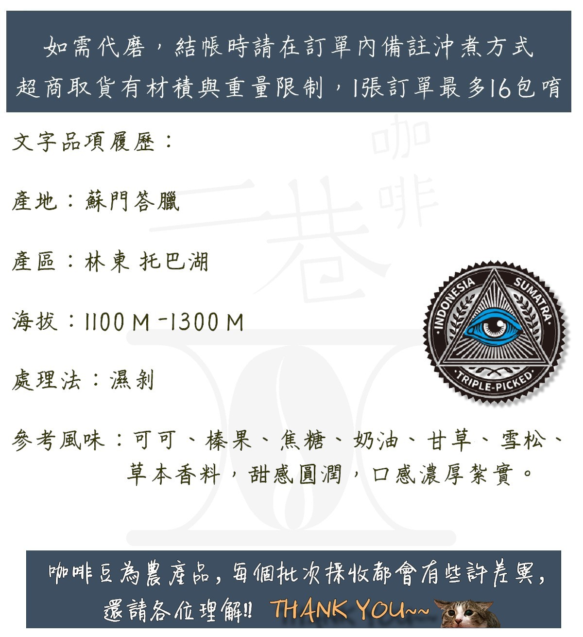 『二巷』☆藍眼曼特寧☆蘇門答臘 林東托巴湖 濕剝 半磅裝 精品咖啡豆 阿拉比卡豆 接單後烘焙 可手沖義式美式冰滴虹
