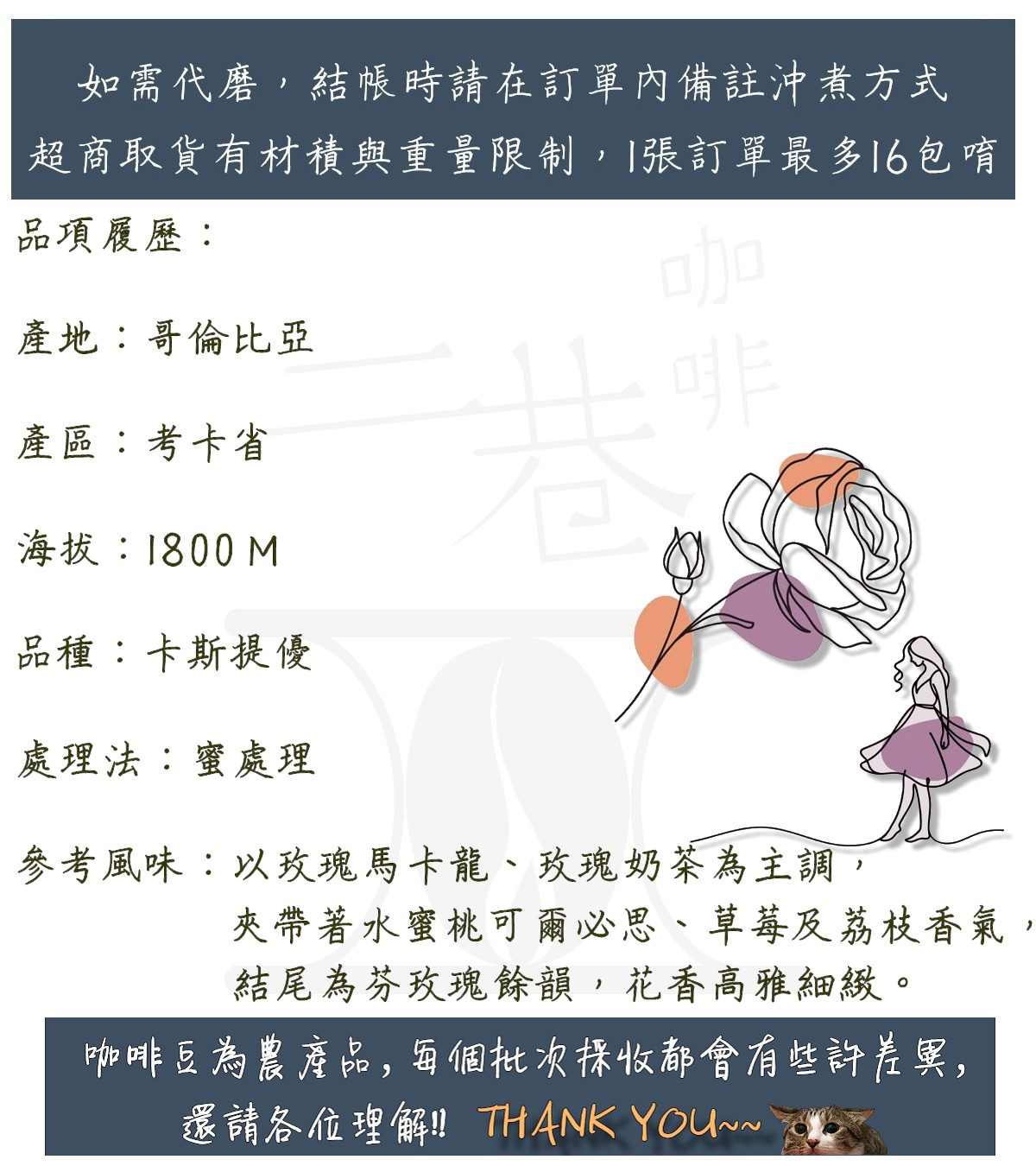 『二巷』☆玫瑰花香☆哥倫比亞 釀酒酵母 蜜處理 半磅裝 精品咖啡 阿拉比卡豆 接單後烘焙 可手沖義式美式冰滴虹吸摩卡壺