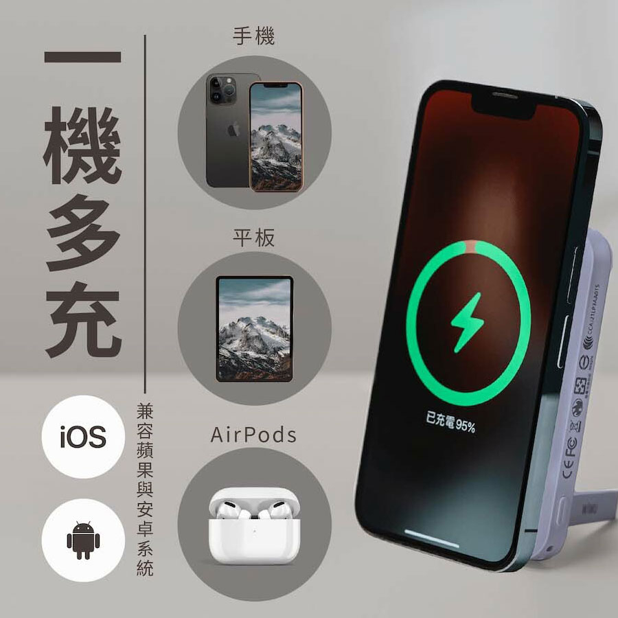 ⭕三種充電輸出模式,USB-A、Type-C、無線充,可同時充三台裝置