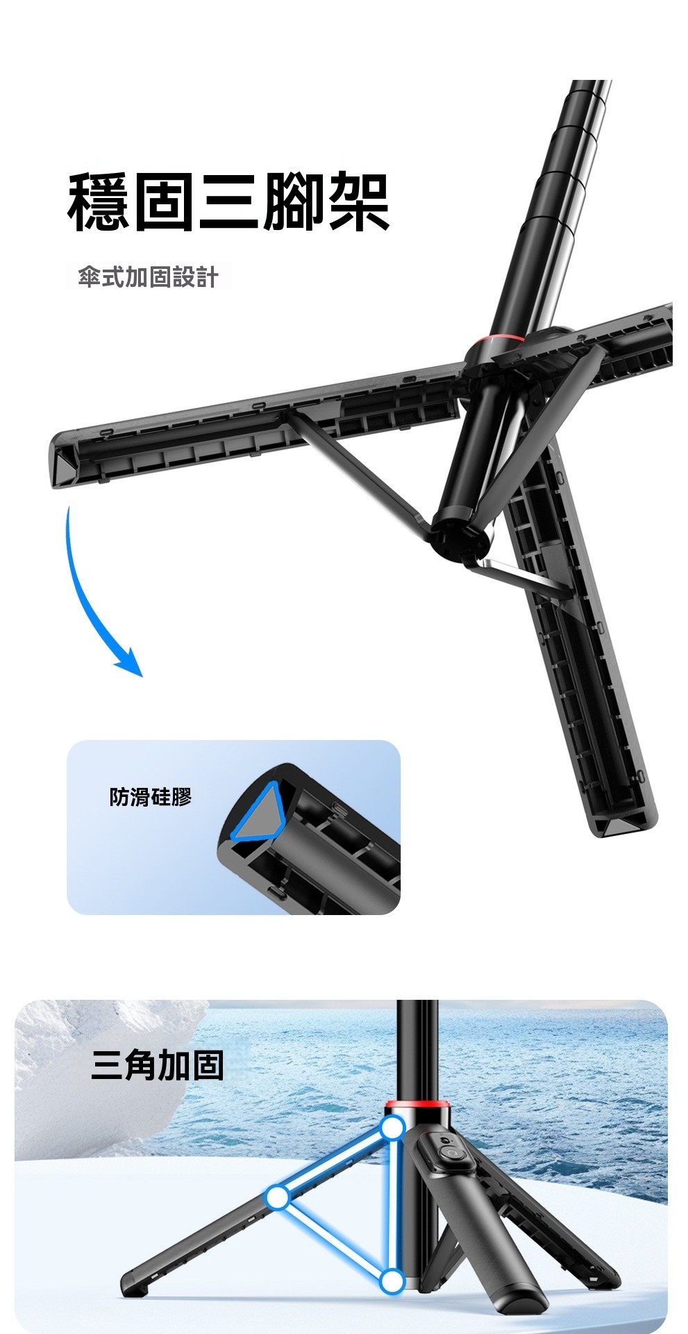 💡 靴頂設計,可加補光燈:再也不怕光線不夠,自拍時輕鬆安裝補光燈,