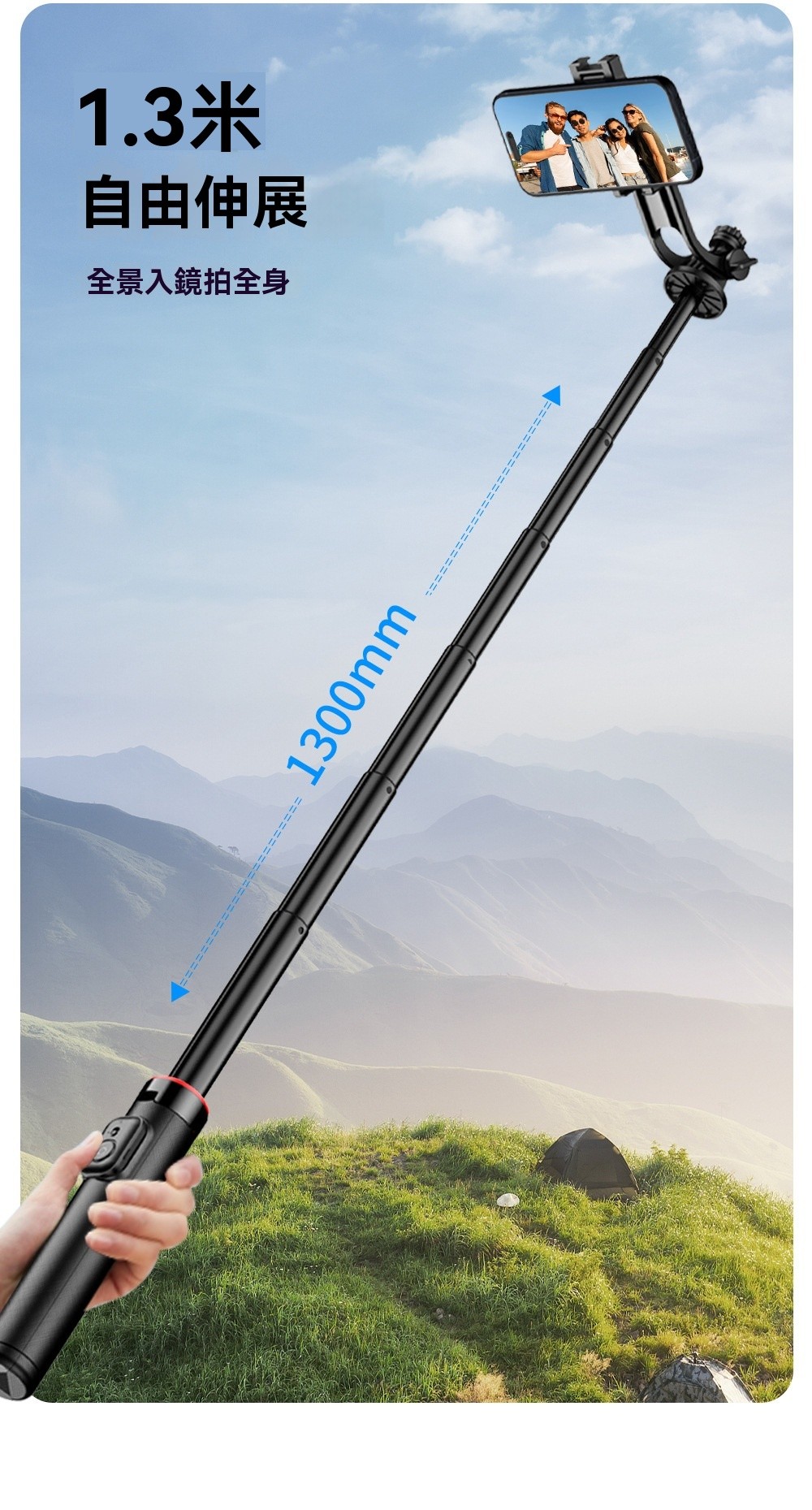 📏 最長可拉伸至1.3米:超長伸縮設計,無論是全景拍攝還是多人合影,