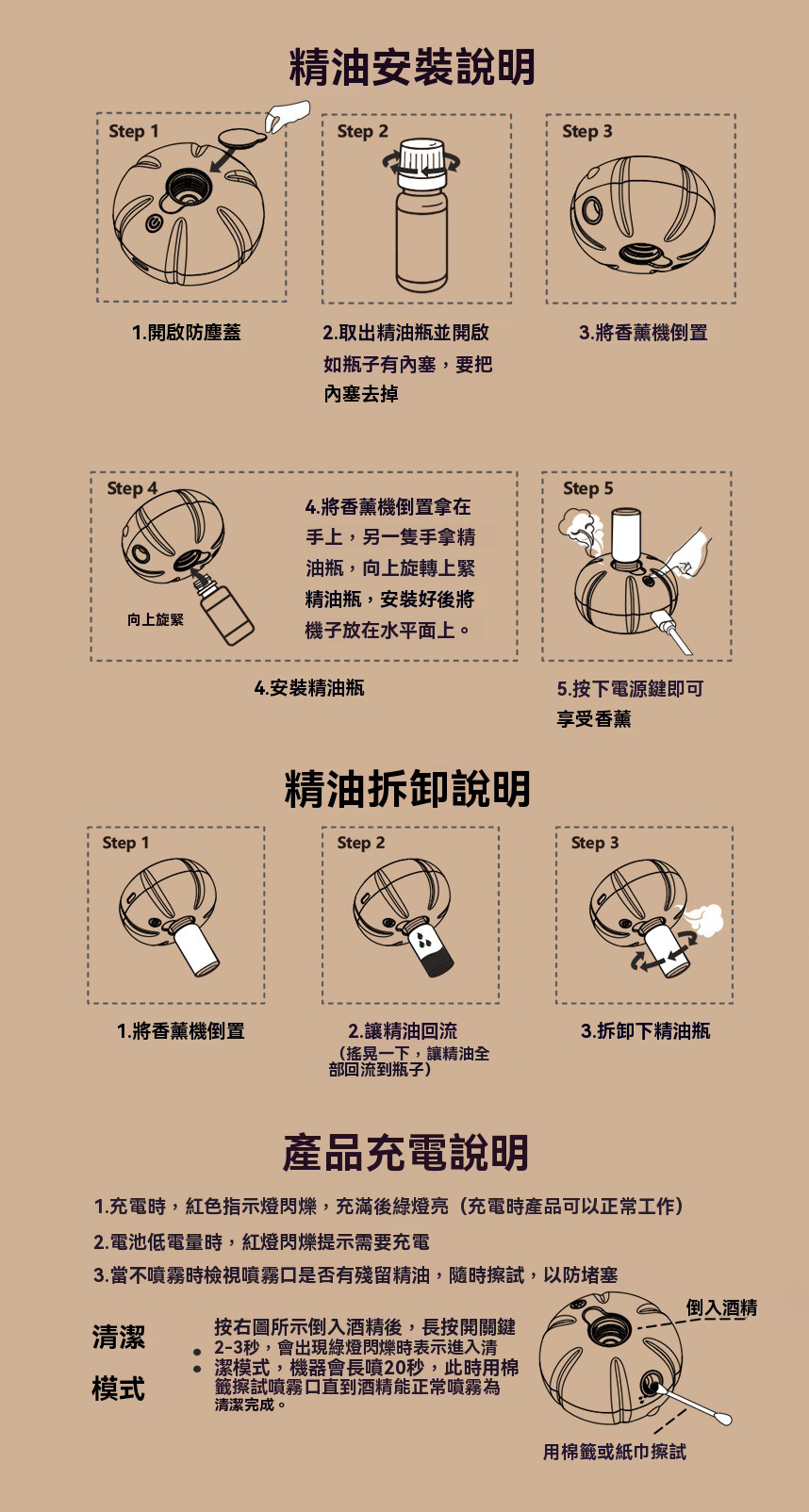 僅可使用柑橘類純精油或著薰衣草類精油,高濃稠的精油會無法噴霧損壞機器