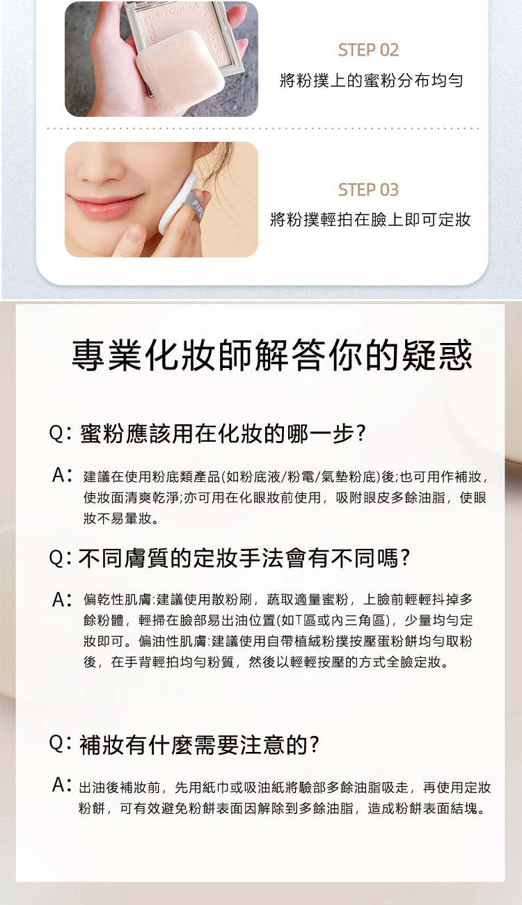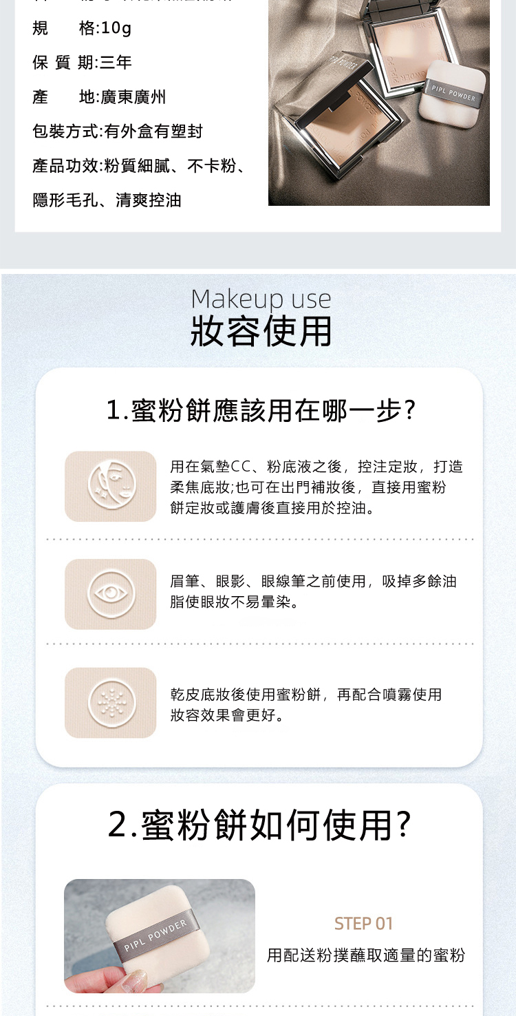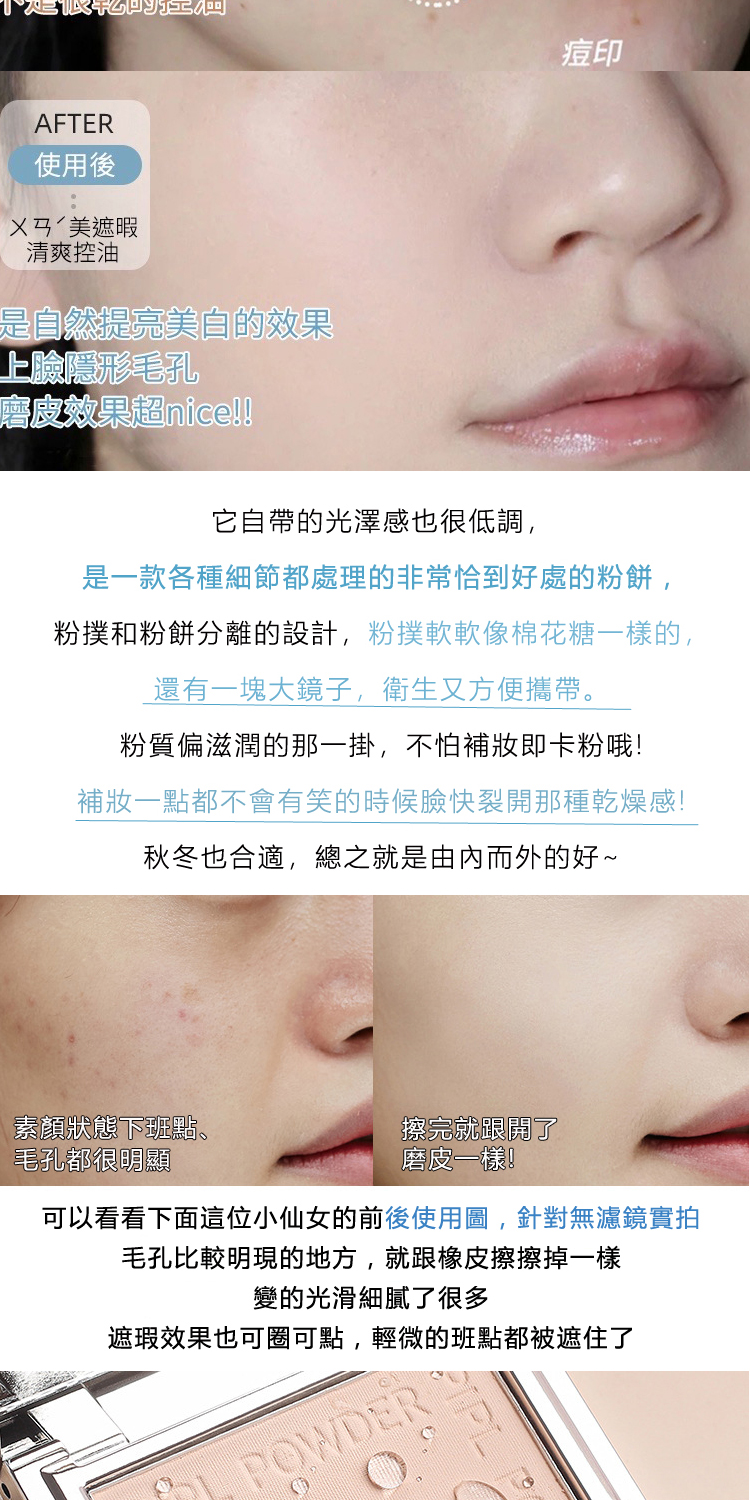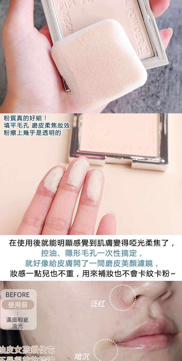產品功效:粉質細膩、不卡粉、隱型毛孔、清爽控油.