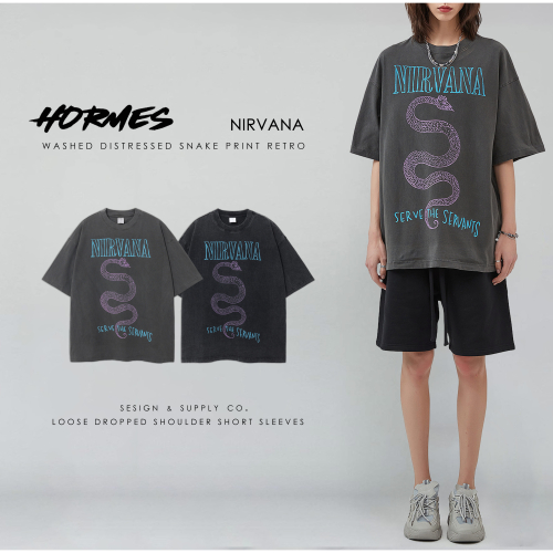 [HORMES] 5223 NIRVANA 蛇王 水洗 仿舊 數碼 短T 寬鬆 落肩 五分袖 蛇印花 復古Tee 短袖