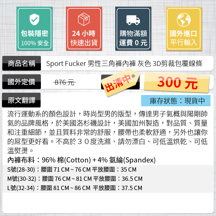Sport Fucker 男性三角褲內褲 灰色 3D剪裁包覆線條 | Brief 美國製造 時尚型男凸囊袋激凸
