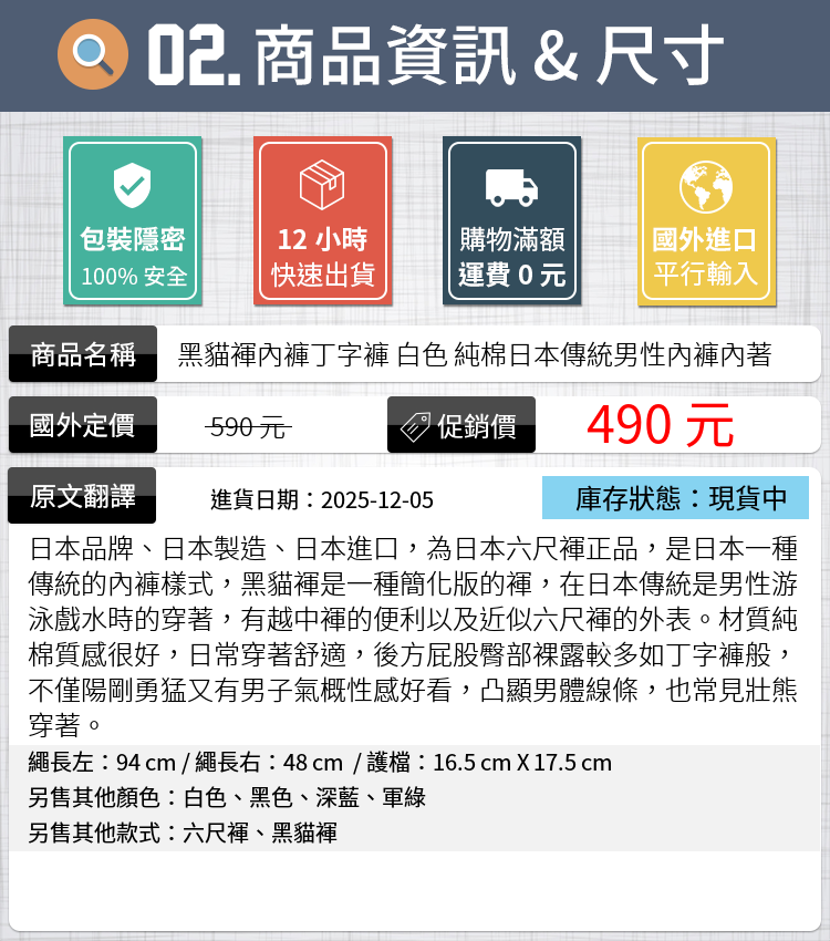 日本品牌、日本製造、日本進口,為日本六尺褌正品,是日本一種傳統的內褲樣式,黑貓褌是一種簡化版的褌,在日本傳統是男性游泳戲水時的穿著,有越中褌的便利以及近似六尺褌的外表。材質純棉質感很好,日常穿著舒適,後方屁股臀部裸露較多如丁字褲般,不僅陽剛勇猛又有男子氣概性感好看,凸顯男體線條,也常見壯熊穿著。