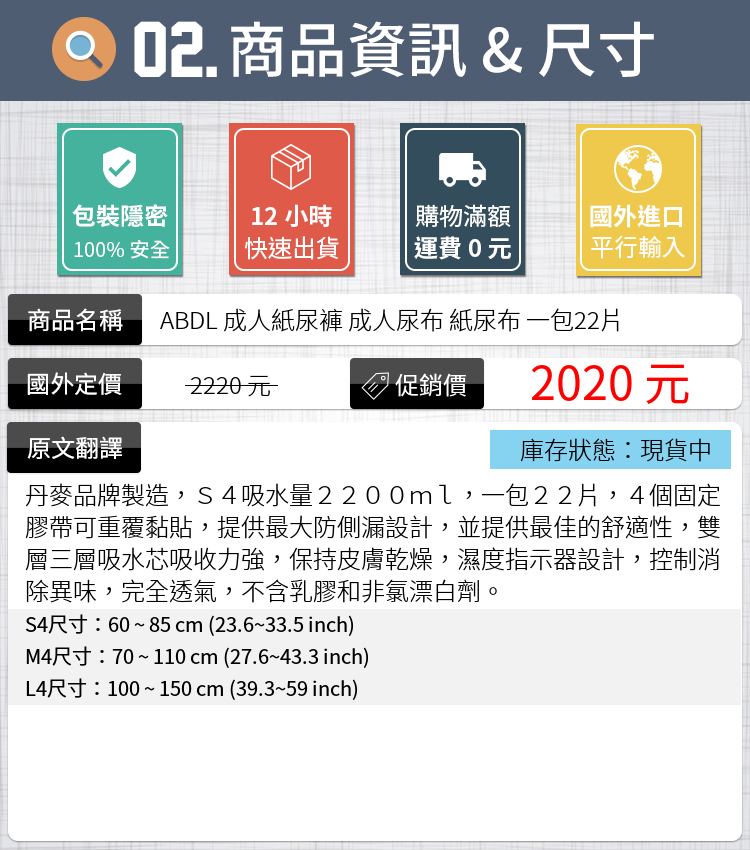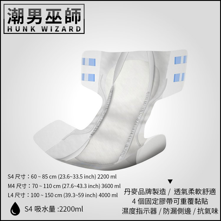 丹麥品牌製造,S4吸水量2200ml,一包22片,4個固定膠帶可重覆黏貼,提供最大防側漏設計,並提供最佳的舒適性,雙層三層吸水芯吸收力強,保持皮膚乾燥,濕度指示器設計,控制消除異味,完全透氣,不含乳膠和非氯漂白劑。