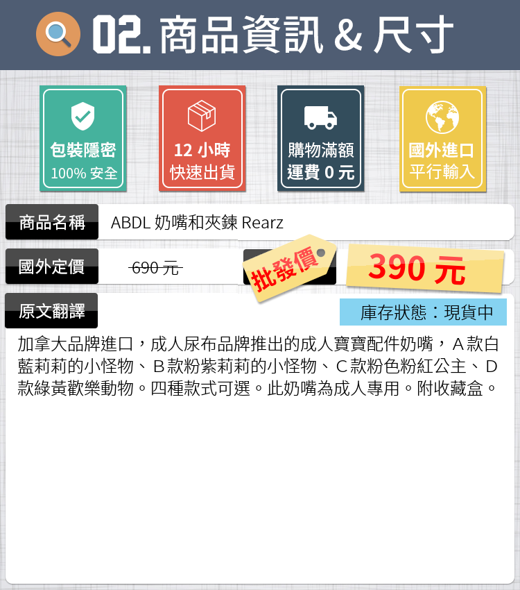 加拿大品牌進口,成人尿布品牌推出的成人寶寶配件奶嘴,A款白藍莉莉的小怪物、B款粉紫莉莉的小怪物、C款粉色粉紅公主、D款綠黃歡樂動物。四種款式可選。此奶嘴為成人專用。附收藏盒。