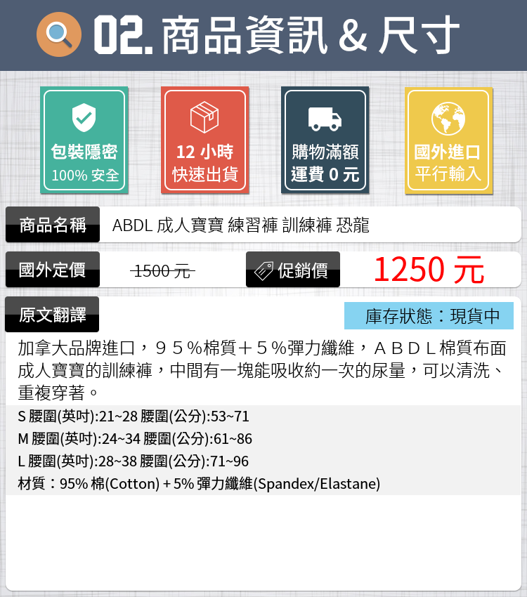加拿大品牌進口,95%棉質+5%彈力纖維,ABDL棉質布面成人寶寶的訓練褲,中間有一塊能吸收約一次的尿量,可以清洗、重複穿著。