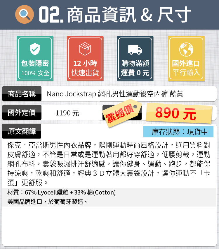 傑克.亞當斯男性內衣品牌,陽剛運動時尚風格設計,選用質料對皮膚舒適,不管是日常或是運動著用都好穿舒適,低腰剪裁,運動網孔布料,囊袋吸濕排汗舒適感,讓你健身、運動、跑步,都能保持涼爽,乾爽和舒適,經典3D立體大囊袋設計,讓你運動不「卡蛋」更舒服。