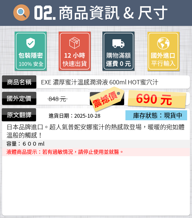 EXE 濃厚蜜汁溫感潤滑液 600ml HOT蜜穴汁 | 高濃度持久連續性愛抽插 熱感水基水溶性潤滑劑 日本
