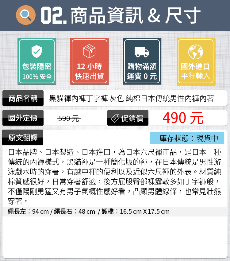 日本品牌、日本製造、日本進口,為日本六尺褌正品,是日本一種傳統的內褲樣式,黑貓褌是一種簡化版的褌,在日本傳統是男性游泳戲水時的穿著,有越中褌的便利以及近似六尺褌的外表。材質純棉質感很好,日常穿著舒適,後方屁股臀部裸露較多如丁字褲般,不僅陽剛勇猛又有男子氣概性感好看,凸顯男體線條,也常見壯熊穿著。