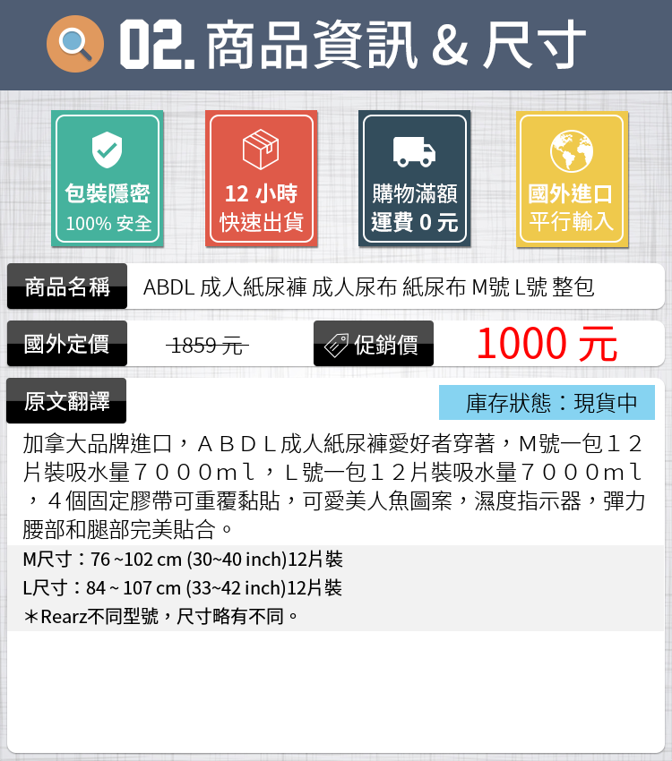加拿大品牌進口,ABDL成人紙尿褲愛好者穿著,M號一包12片裝吸水量7000ml,L號一包12片裝吸水量7000ml,4個固定膠帶可重覆黏貼,可愛美人魚圖案,濕度指示器,彈力腰部和腿部完美貼合。