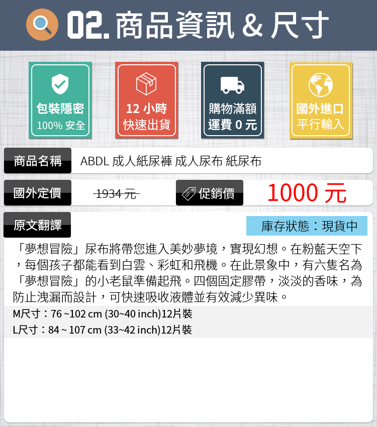M尺寸:76 ~102 cm (30~40 inch)12片裝|L尺寸:84 ~ 107 cm (33~42 inch)12片裝
