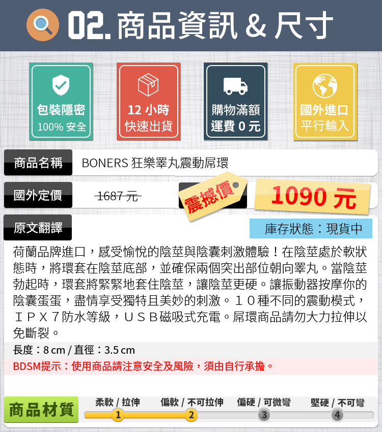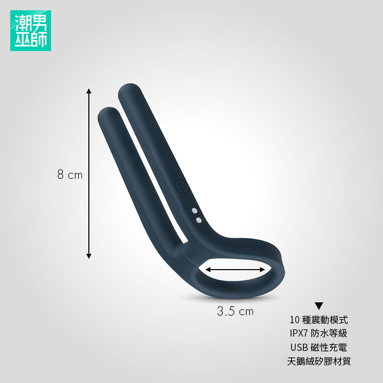 荷蘭品牌進口,感受愉悅的陰莖與陰囊刺激體驗!在陰莖處於軟狀態時,將環套在陰莖底部,並確保兩個突出部位朝向睪丸。當陰莖勃起時,環套將緊緊地套住陰莖,讓陰莖更硬。讓振動器按摩你的陰囊蛋蛋,盡情享受獨特且美妙的刺激。10種不同的震動模式,IPX7防水等級,USB磁吸式充電。屌環商品請勿大力拉伸以免斷裂。