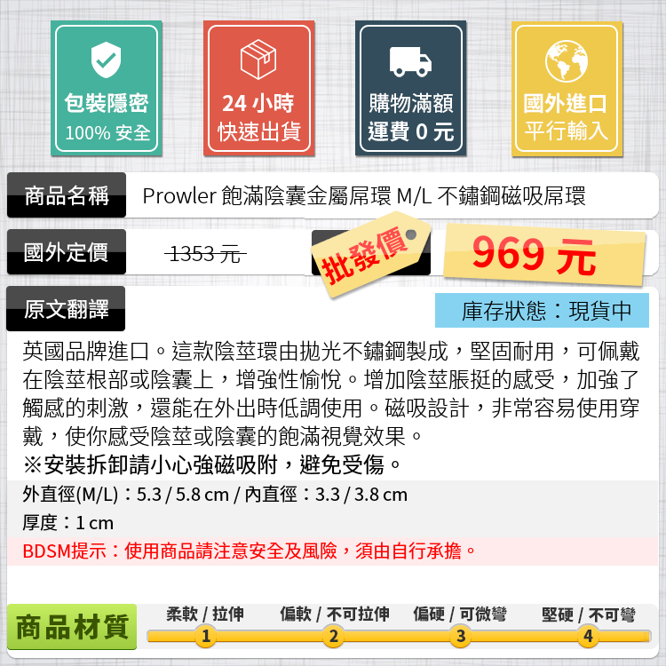 英國品牌進口。這款陰莖環由拋光不鏽鋼製成,堅固耐用,