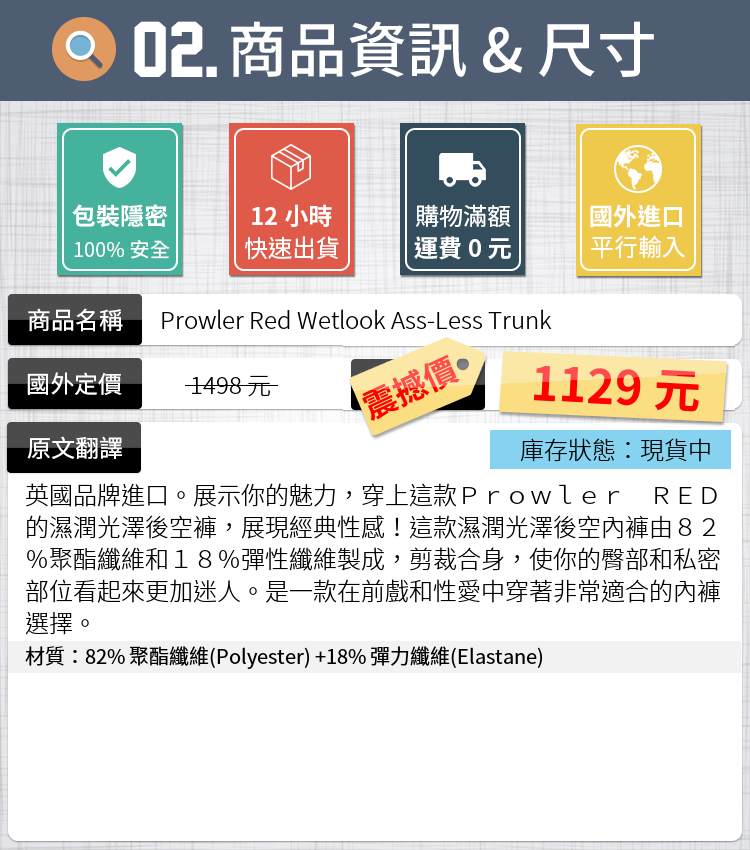 英國品牌進口。展示你的魅力,穿上這款Prowler RED的濕潤光澤後空褲,展現經典性感!