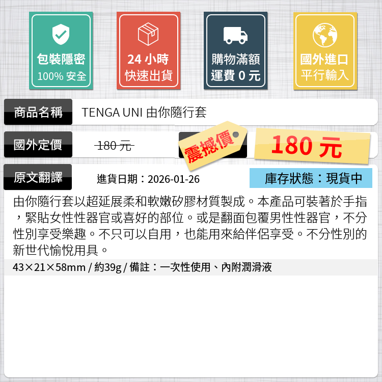 43×21×58mm / 約39g / 備註:一次性使用、內附潤滑液