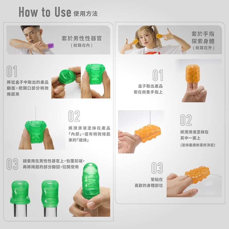 由你隨行套以超延展柔和軟嫩矽膠材質製成。本產品可裝著於手指,緊貼女性性器官或喜好的部位。或是翻面包覆男性性器官,不分性別享受樂趣。不只可以自用,也能用來給伴侶享受。不分性別的新世代愉悅用具。