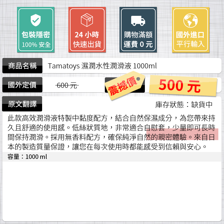 此款高效潤滑液特製中黏度配方,結合自然保濕成分,為您帶來持久且舒適的使用感。低絲狀質地,非常適合自慰套,少量即可長時間保持潤滑。採用無香料配方,確保純淨自然的親密體驗。來自日本的製造質量保證,讓您在每次使用時都能感受到信賴與安心。