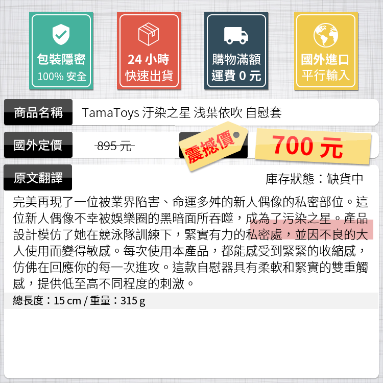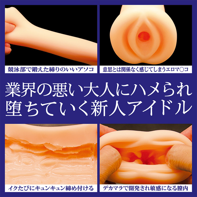 完美再現了一位被業界陷害、命運多舛的新人偶像的私密部位。這位新人偶像不幸被娛樂圈的黑暗面所吞噬,成為了污染之星。產品設計模仿了她在競泳隊訓練下,緊實有力的私密處,並因不良的大人使用而變得敏感。每次使用本產品,都能感受到緊緊的收縮感,仿佛在回應你的每一次進攻。這款自慰器具有柔軟和緊實的雙重觸感,提供低至高不同程度的刺激。