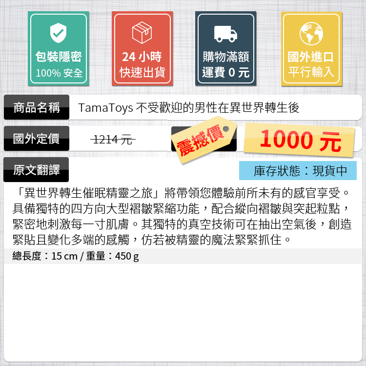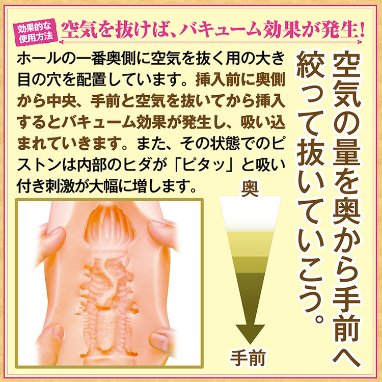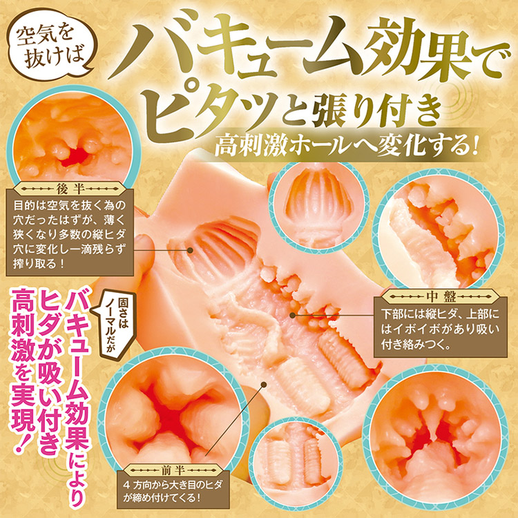 「異世界轉生催眠精靈之旅」將帶領您體驗前所未有的感官享受。具備獨特的四方向大型褶皺緊縮功能,配合縱向褶皺與突起粒點,緊密地刺激每一寸肌膚。其獨特的真空技術可在抽出空氣後,創造緊貼且變化多端的感觸,仿若被精靈的魔法緊緊抓住。