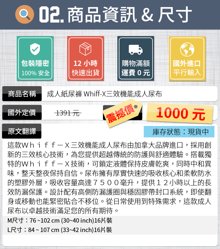 這款Whiff-X三效機能成人尿布由加拿大品牌進口,採用創新的三效核心技術,為您提供超越傳統的防護與舒適體驗。搭載獨特的Whiff-X技術,可鎖定液體保持皮膚乾爽,同時中和異味,整天整夜保持自信。尿布擁有厚實快速的吸收核心和柔軟防水的塑膠外層,吸收容量高達7500毫升,提供12小時以上的長效防漏保護。設計配有高側防漏護圈與穩固膠帶封口系統,即使翻身或移動也能緊密貼合不移位。從日常使用到特殊需求,這款成人尿布以卓越技術滿足您的所有期待。