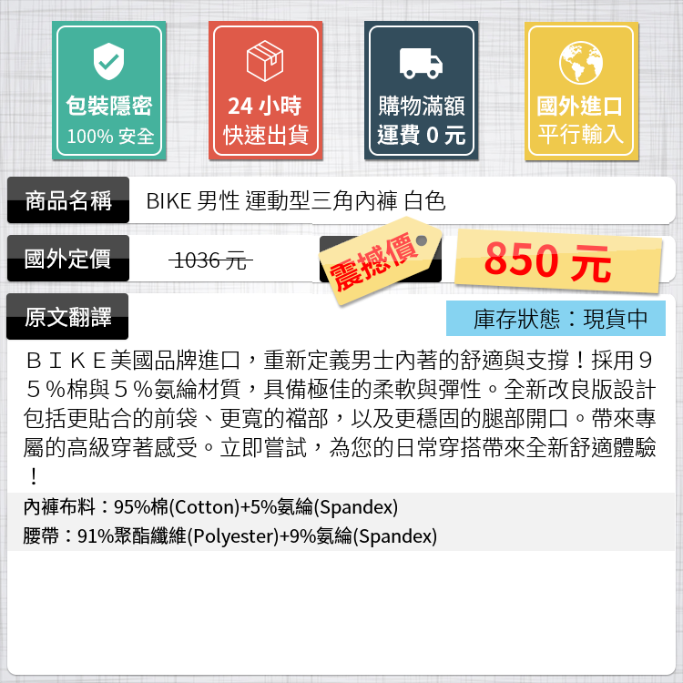 BIKE美國品牌進口,重新定義男士內著的舒適與支撐!採用95%棉與5%氨綸材質,具備極佳的柔軟與彈性。全新改良版設計包括更貼合的前袋、更寬的襠部,以及更穩固的腿部開口。帶來專屬的高級穿著感受。立即嘗試,為您的日常穿搭帶來全新舒適體驗!