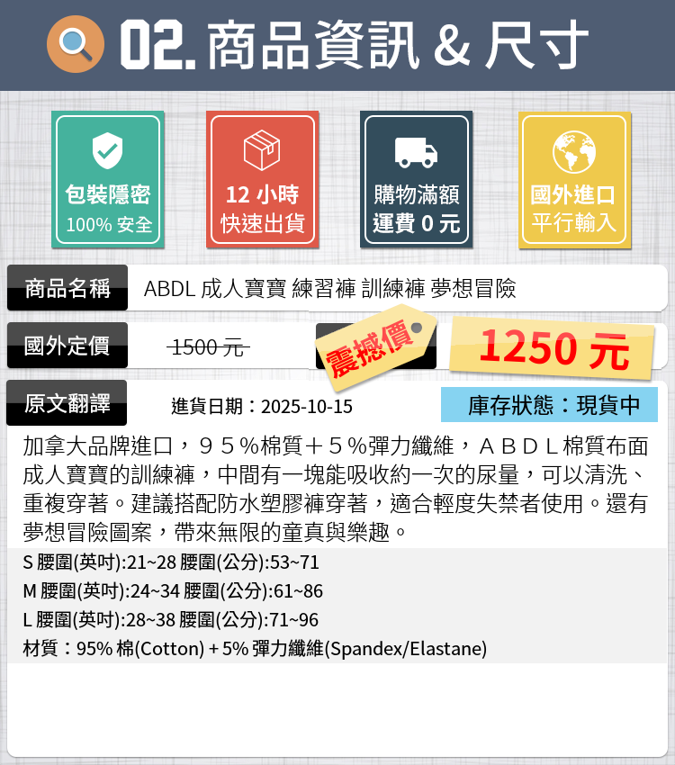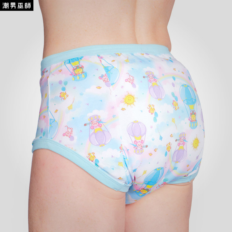 加拿大品牌進口,95%棉質+5%彈力纖維,ABDL棉質布面成人寶寶的訓練褲,中間有一塊能吸收約一次的尿量,可以清洗、重複穿著。建議搭配防水塑膠褲穿著,適合輕度失禁者使用。還有夢想冒險圖案,帶來無限的童真與樂趣。