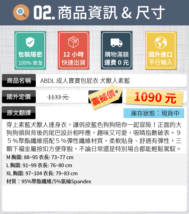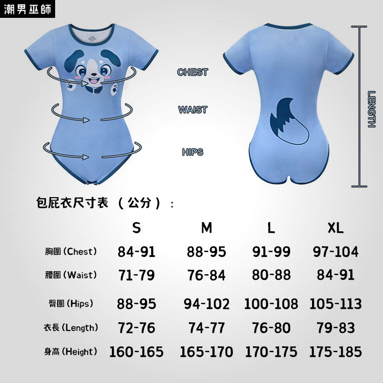 穿上素藍犬獸人連身衣,讓俏皮藍色狗狗陪你一起冒險!正面的大狗狗頭與背後的尾巴設計相呼應,趣味又可愛,吸睛指數破表。95%聚酯纖維搭配5%彈性纖維材質,柔軟貼身、舒適有彈性,三顆下襠金屬按扣方便穿脫,不論日常還是特別場合都能輕鬆駕馭。