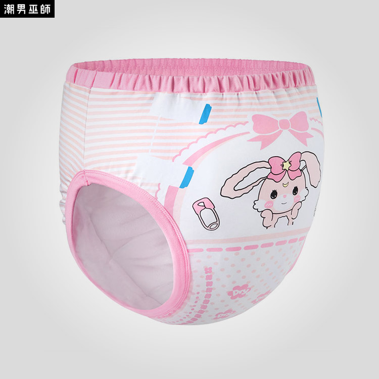 可重複使用的兔兔寶寶訓練褲,採用95%棉+5%彈性纖維製成,內層厚襠為100%聚酯纖維,吸收量200ml。擁有厚實吸收芯與彈性腰腿圍,搭配可愛粉紅兔兔圖樣,柔軟舒適,適合日常輕度滲漏防護。非防水設計,建議加穿塑膠褲增強保護。