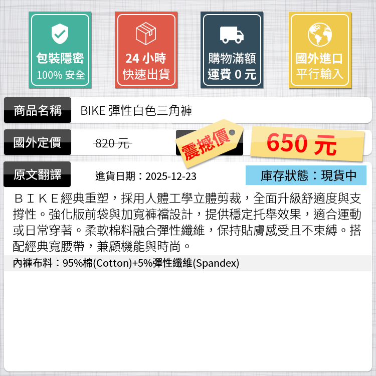 內褲布料:95%棉(Cotton)+5%彈性纖維(Spandex)