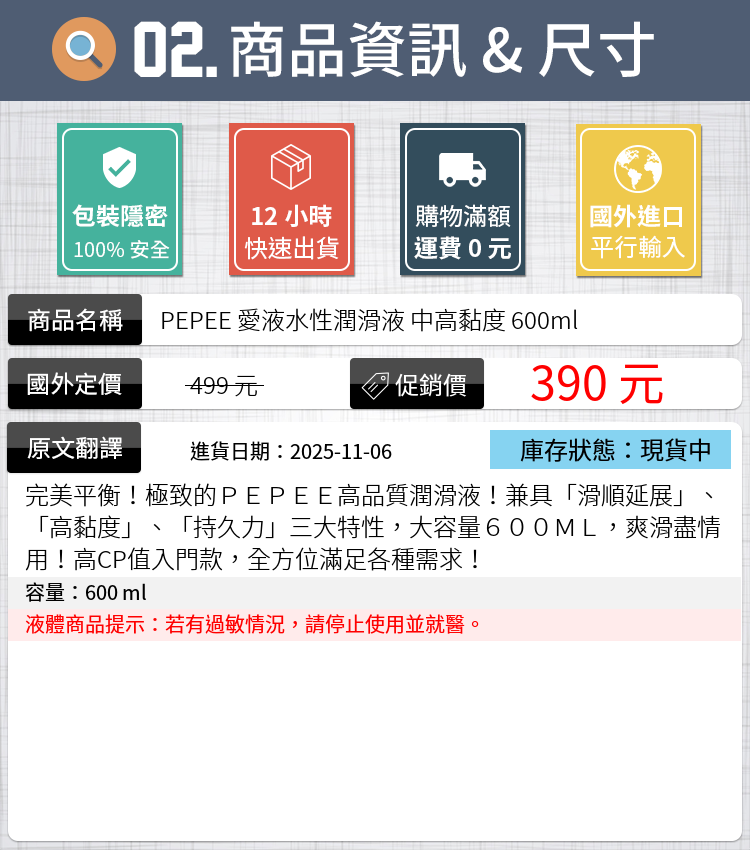 完美平衡!極致的PEPEE高品質潤滑液!兼具「滑順延展」、「高黏度」、「持久力」三大特性,大容量600ML,爽滑盡情用!高CP值入門款,全方位滿足各種需求!