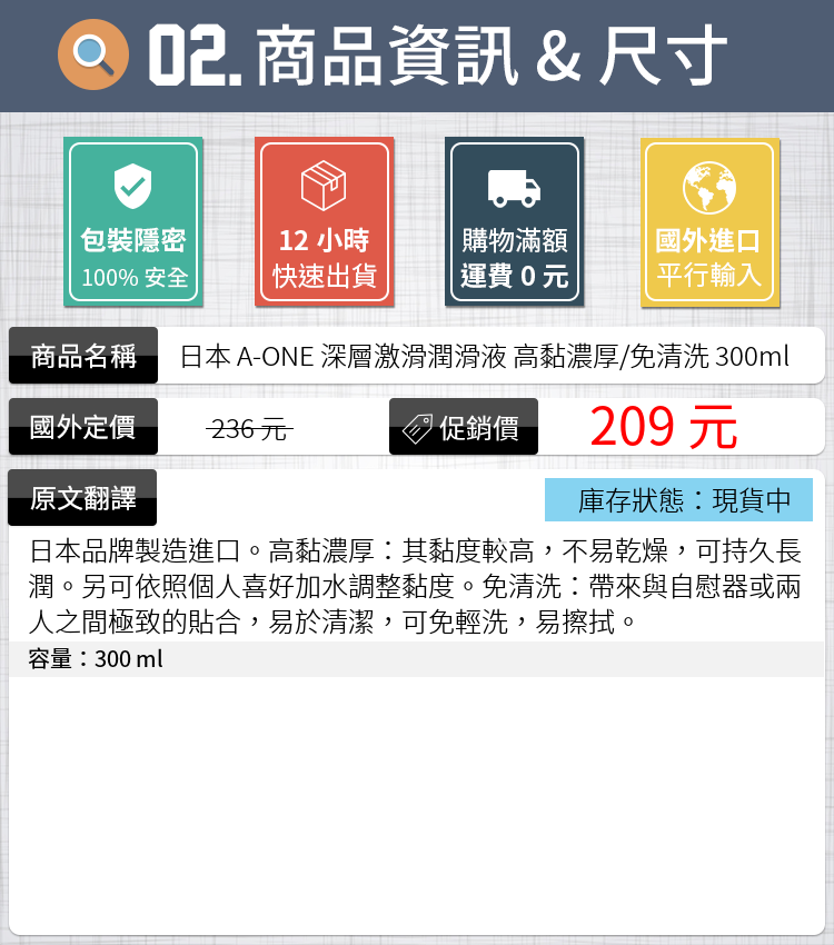 日本品牌製造進口。高黏濃厚:其黏度較高,不易乾燥,可持久長潤。另可依照個人喜好加水調整黏度。免清洗:帶來與自慰器或兩人之間極致的貼合,易於清潔,可免輕洗,易擦拭。