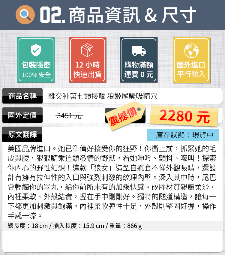 美國品牌進口。她已準備好接受你的狂野!你衝上前,抓緊她的毛皮與腰,狠狠騎乘這頭發情的野獸,看她呻吟、顫抖、嚎叫!探索你內心的野性幻想!這款「狼女」造型自慰套不僅外觀吸睛,還設計有擁有拉伸性的入口與強烈刺激的紋理內壁。深入其中時,尾巴會輕觸你的睪丸,給你前所未有的加乘快感。矽膠材質親膚柔滑,內裡柔軟、外殼結實,握在手中剛剛好。獨特的隧道構造,讓每一下都更加刺激與飽滿。內裡柔軟彈性十足,外殼則堅固好握,操作手感一流。