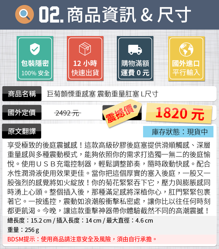 享受極致的後庭震撼感!這款高級矽膠後庭塞提供滑順觸感、深層重量感與多種震動模式,能夠依照你的需求打造獨一無二的後庭愉悅。使用USB充電控制器,輕鬆調整節奏,隨時啟動快感。配合水性潤滑液使用效果更佳。當你把這個厚實的塞入後庭,一股又一股強烈的感覺將如火綻放!你的菊花緊緊吞下它,壓力與膨脹感同時湧上心頭。整個插入後,那種滿足感將深植你心,肛門緊緊包裹著它。一按遙控,震動如浪潮般衝擊私密處,讓你比以往任何時刻都更飢渴。今晚,讓這款重擊神器帶你體驗截然不同的高潮震撼!