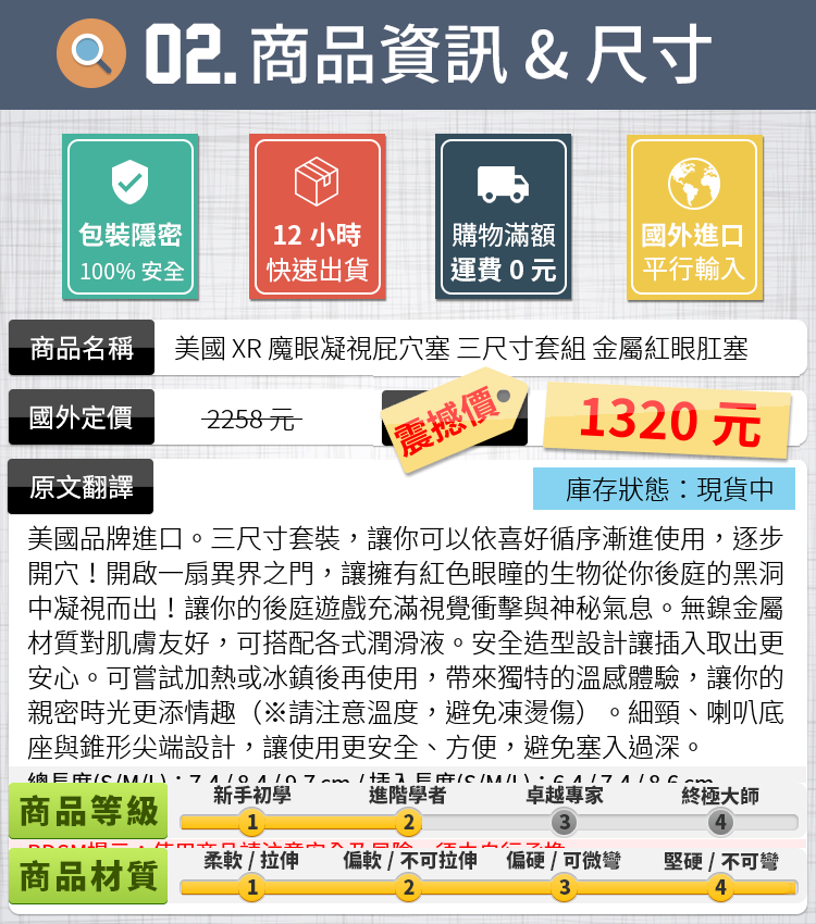 美國品牌進口。三尺寸套裝,讓你可以依喜好循序漸進使用,逐步開穴!開啟一扇異界之門,讓擁有紅色眼瞳的生物從你後庭的黑洞中凝視而出!讓你的後庭遊戲充滿視覺衝擊與神秘氣息。無鎳金屬材質對肌膚友好,可搭配各式潤滑液。安全造型設計讓插入取出更安心。可嘗試加熱或冰鎮後再使用,帶來獨特的溫感體驗,讓你的親密時光更添情趣(※請注意溫度,避免凍燙傷)。細頸、喇叭底座與錐形尖端設計,讓使用更安全、方便,避免塞入過深。