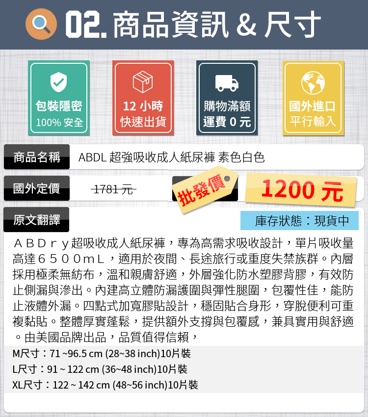 ABDry超吸收成人紙尿褲,專為高需求吸收設計,單片吸收量高達6500mL,適用於夜間、長途旅行或重度失禁族群。內層採用極柔無紡布,溫和親膚舒適,外層強化防水塑膠背膠,有效防止側漏與滲出。內建高立體防漏護圍與彈性腿圍,包覆性佳,能防止液體外漏。四點式加寬膠貼設計,穩固貼合身形,穿脫便利可重複黏貼。整體厚實蓬鬆,提供額外支撐與包覆感,兼具實用與舒適。由美國品牌出品,品質值得信賴,