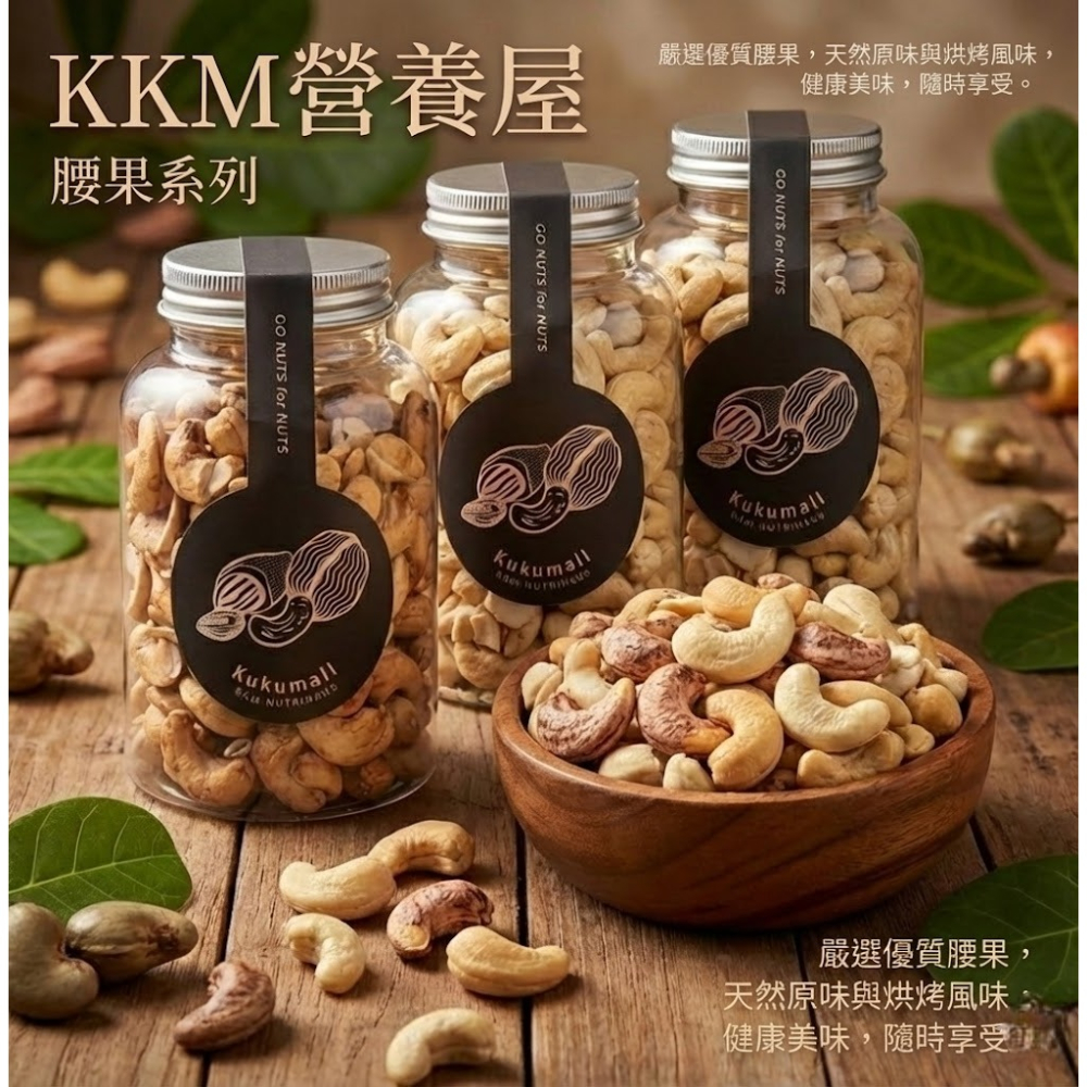 KKM 營養屋嚴選顆顆飽滿圓潤的優質腰果,保留腰果本身的奶油香氣與細膩甜味,不加調味,讓原料成為風味的主角。