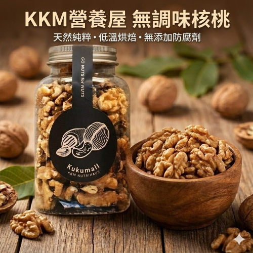 KKM 營養屋選用品質穩定、果仁飽滿的優質核桃製作,不加調味,保留核桃本身厚實的堅果香氣與自然風味,呈現原料最純粹的樣貌。