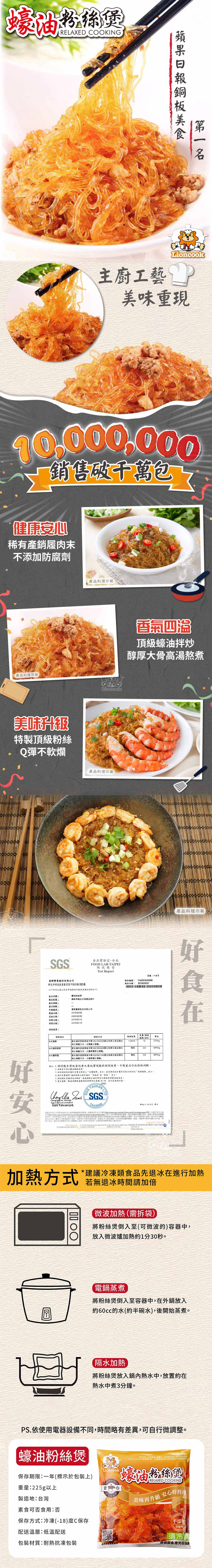 【總舖獅叮嚀】 使用擁有產銷履歷的豬肉末與頂級蠔油拌炒,再加入古法熬製的金黃大骨高湯讓粉絲吸附濃郁美味,除了可以單獨成為一道佳餚外,也能與海鮮或牛肉、雞肉及豬肉搭配成為海鮮粉絲煲或是牛肉粉絲煲。總舖獅建議您可以先將海鮮或肉品以蔥蒜等配料爆香,若喜歡辣味也能加入適量辣椒唷! 再將撕開包裝後的粉絲煲倒入一起拌煮,待湯汁快收乾時關火放置約兩三分鐘,粉絲會將剩餘湯汁吸附,在家也能享用頂級的美食唷。