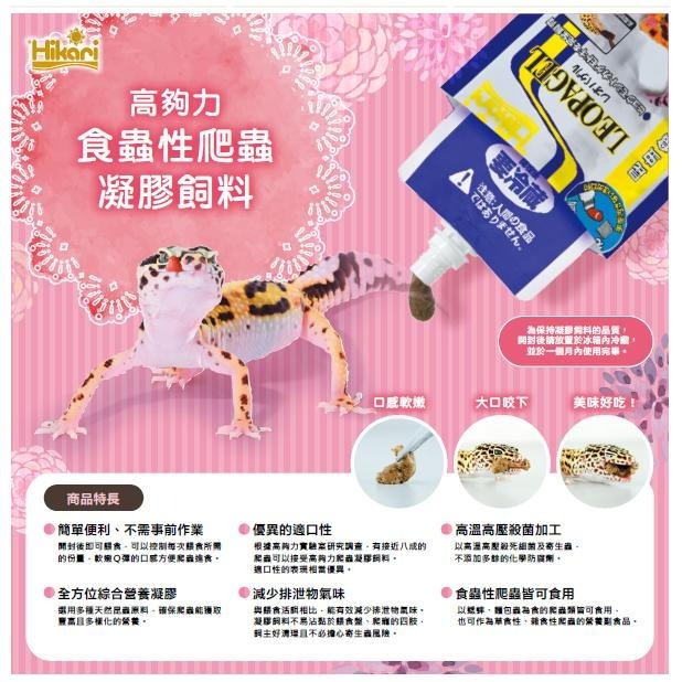 適用於所有食蟲性爬蟲類,如豹紋守宮、日本草蜥、箱龜、美洲鬣蜥、睫角守宮、鬆獅蜥、藍舌蜥....等 針對爬蟲需求研發的日常飼料,含有豐富的蠶蛹及麵包蟲成分,提供食蟲性爬蟲類全方位的營養,促進健康成長 以蟋蟀、麵包蟲為食的爬蟲類皆可食用,也可作為草食性、雜食性爬蟲的營養副食品 以高溫高壓殺死細菌及寄生蟲,不添加多餘的化學防腐劑。與活餌相比,能夠有效減少排泄物的氣味 凝膠飼料不易沾黏於餵食盤、爬寵的四肢,好清理且不必擔心寄生蟲風險